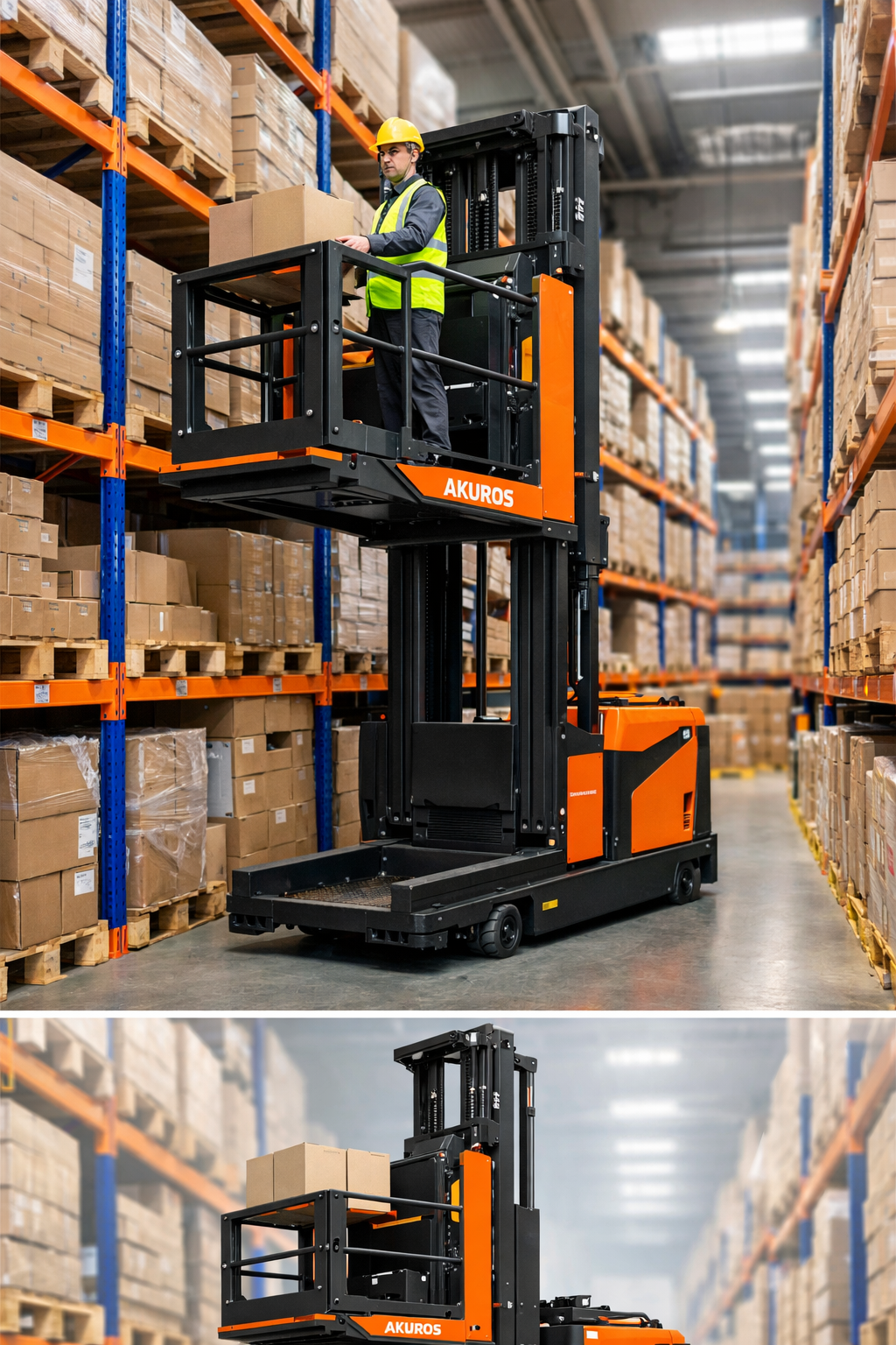 The Akuros high level order picker forklift solves this by allowing the operator to rise together
